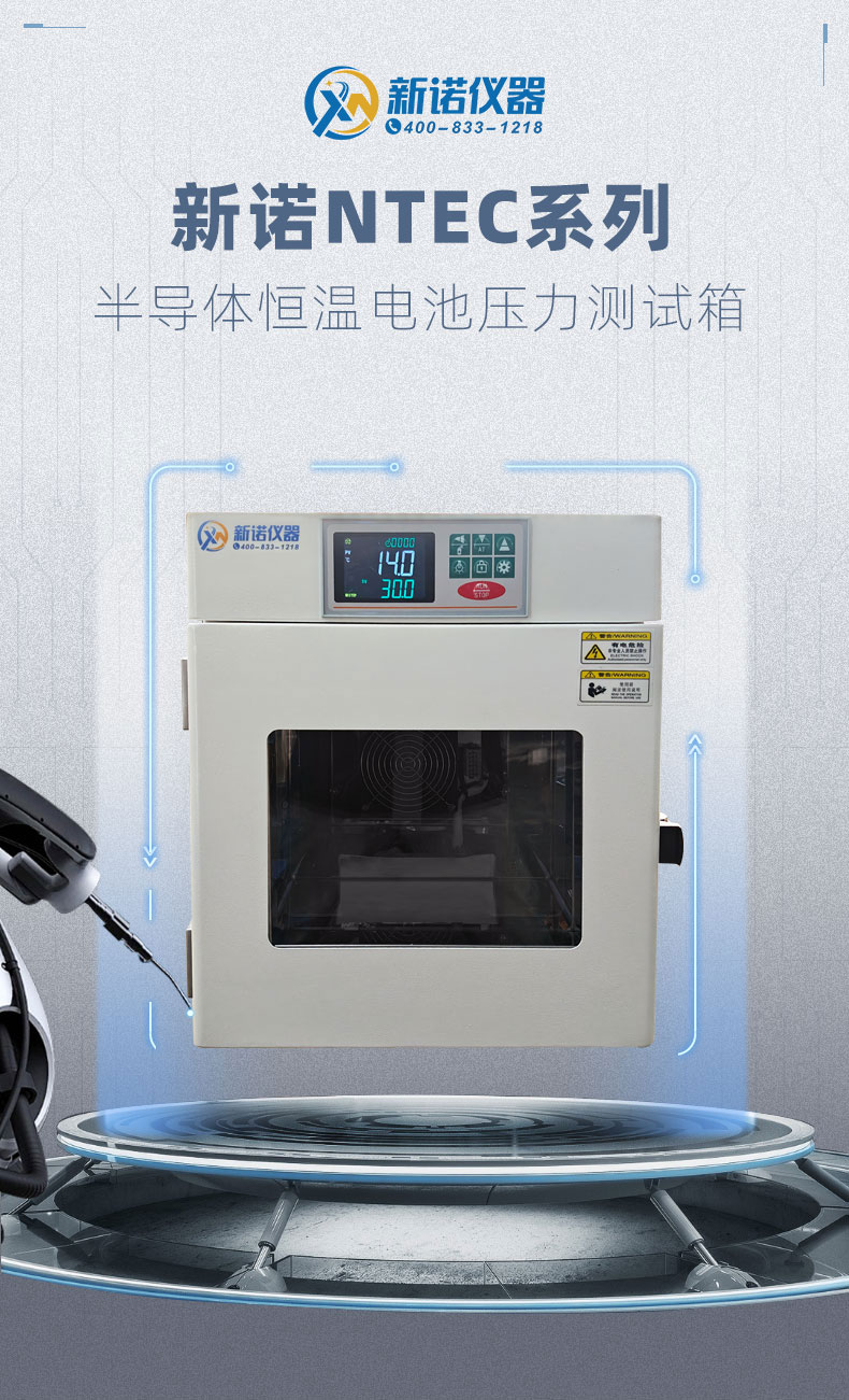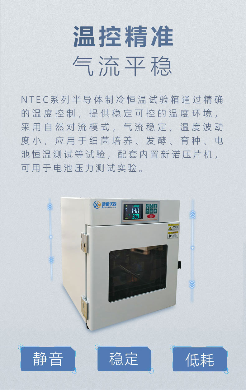 我司新推出了NTEC系列半导体制冷恒温试验箱通过精确的温度控制,提供稳定可控的温度环境,采用自然对流模式,气流稳定,温度波动度小,应用于细菌培养、发酵、育种、电池恒温测试等试验,配套内置新诺压片机,可用于电池压力测试实验。